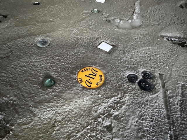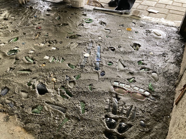 凸凹になっている出入口をモルタルで補修し、そこに前回砕いたガラス片やビー玉、小物など、いろんな想いの詰まった品々を埋め込んでいきます。