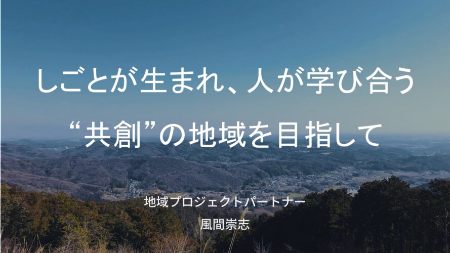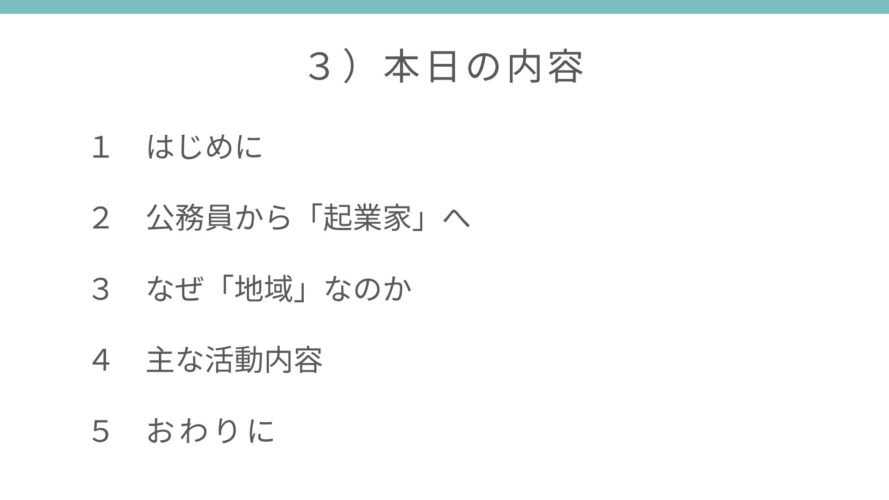 中学校のキャリア・進路担当の先生方向けは初めてのことでしたが、ご担当の先生との打合せを踏まえて、タイトルは「しごとが生まれ、人が学び合う共創の地域を目指して」としました。