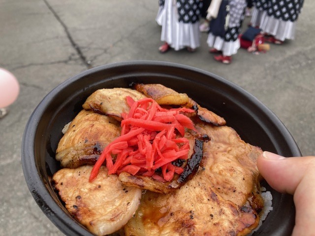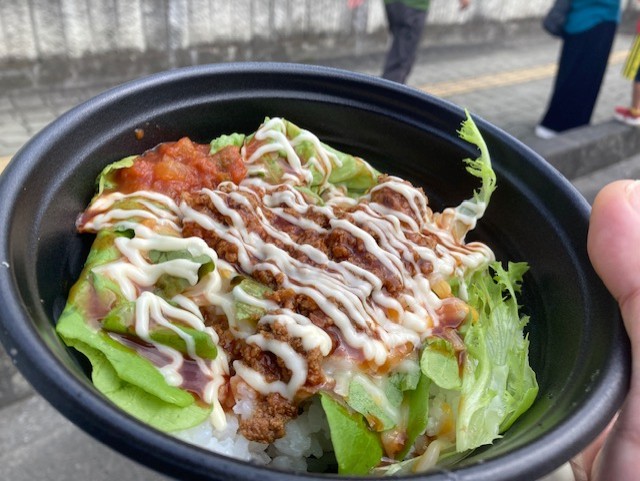 坂戸よさこいは初出店という沖縄カフェはれさんのタコライスと、豚肉を焼く香ばし香りが漂っていた豚丼まささんの豚丼。